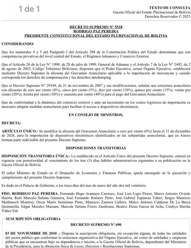 de 13 de enero de 2026.- Se modifica la alicuota del Gravamen Arancelario a cero por ciento (0%) hata el 31 de diciembre de 2026, para la importación de dispositivos electrónicos identificados en supartidas arancelarias, que en Anexo forman parte Indivisible del presente Decreto Supremo